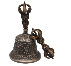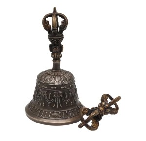 Die schön verzierte Glocke hat ein Höhe von etwa 14 cm, die Gesamtlänge des Dorje beträgt ca. 10 cm. Beide wiegen zusammen etwa 390 g.
