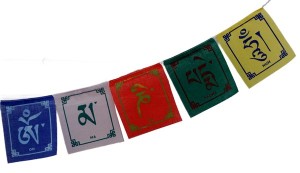 Diese handgefertigte Gebetsfahne besteht aus fünf farbigen Stoffbahnen – Blau, Weiß, Rot, Grün und Gelb – die jeweils eines der fünf Elemente (Himmel, Luft, Feuer, Wasser, Erde) repräsentieren. Die Fahnen sind mit dem Mantra sowie weiteren symbolischen Motiven bedruckt und werden traditionell an heiligen Orten oder in der Natur aufgehängt, damit der Wind die Gebete in alle Himmelsrichtungen trägt.