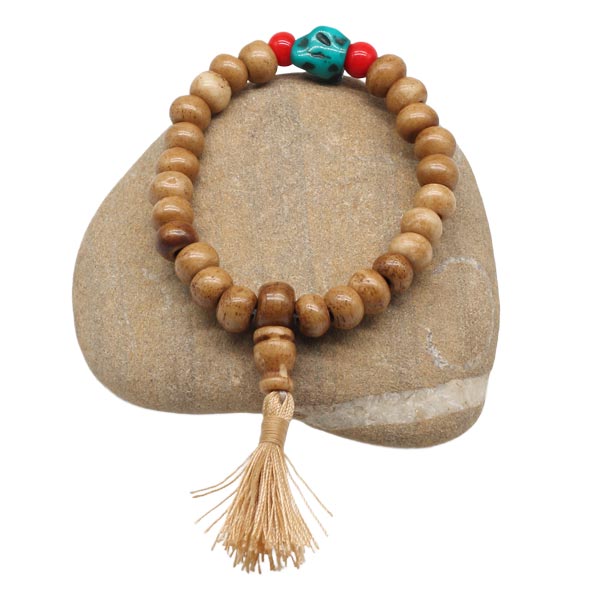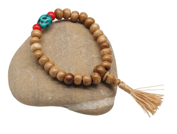 Hand-Mala aus Horn, natur, mit einem türkisen und zwei roten Steinchen.