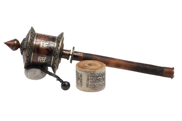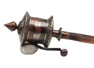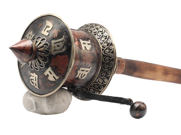 Auf die Oberfläche dieser großen Gebetsmühle ist das tibetischen Mantra "Om Mani Padme Hum", das übersetzt soviel, wie "Du Juwel in der Lotusblüte" bedeutet, eingearbeitet. Im Korpus befindet sich eine Papierrolle mit weiteren aufgedruckten, tibetischen Mantras.