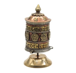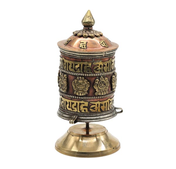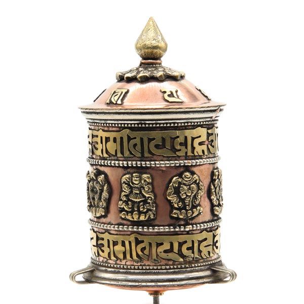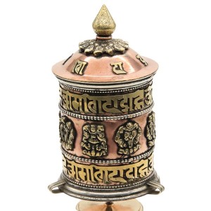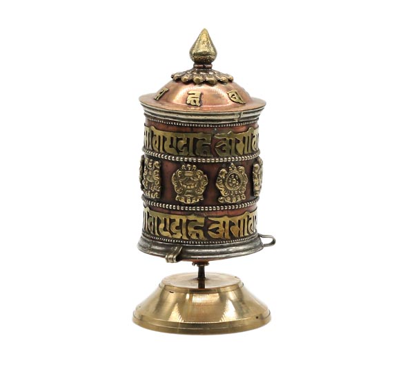 Im Korpus der aus Kupfer, Messing und Weißmetall gefertigten Gebetsmühle befindet sich eine Papierrolle, die ebenfalls mit wichtigen Mantras, beschrieben ist.