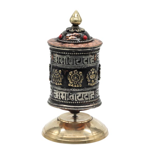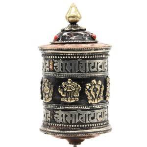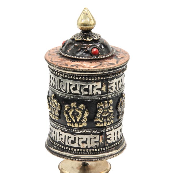 Im Korpus der aus Kupfer, Messing und Weißmetall gefertigten Gebetsmühle befindet sich eine Papierrolle, die ebenfalls mit wichtigen Mantras, beschrieben ist.