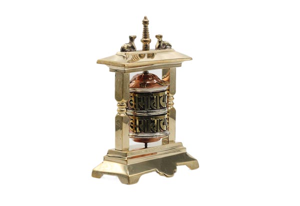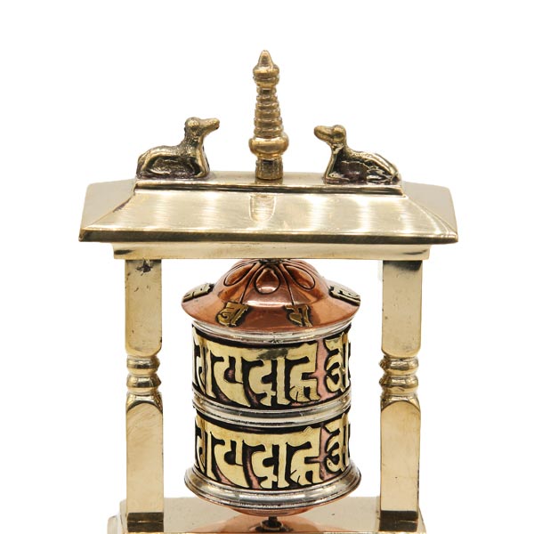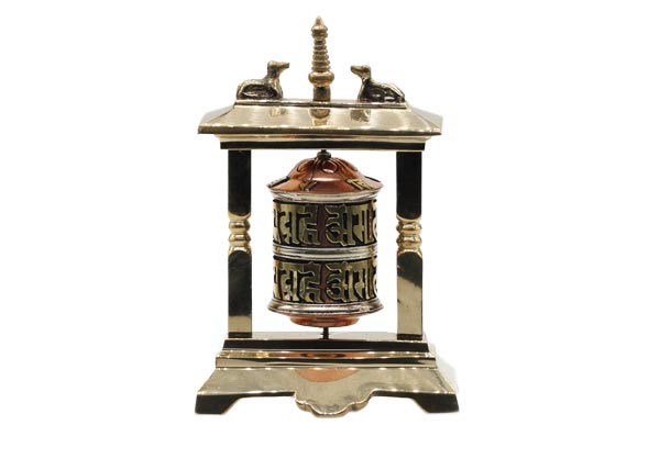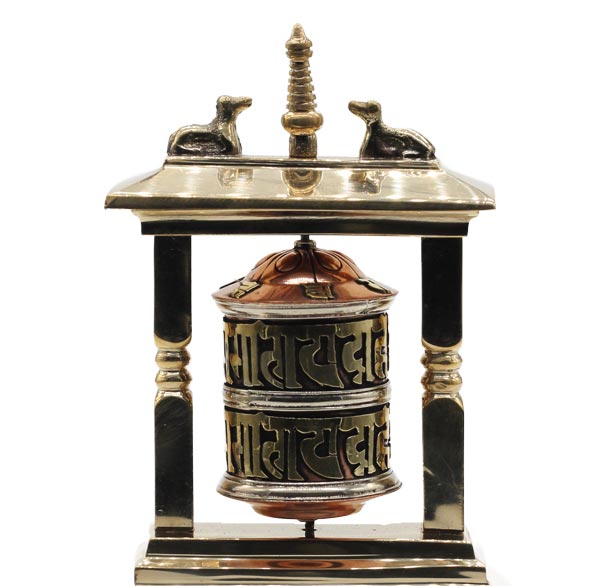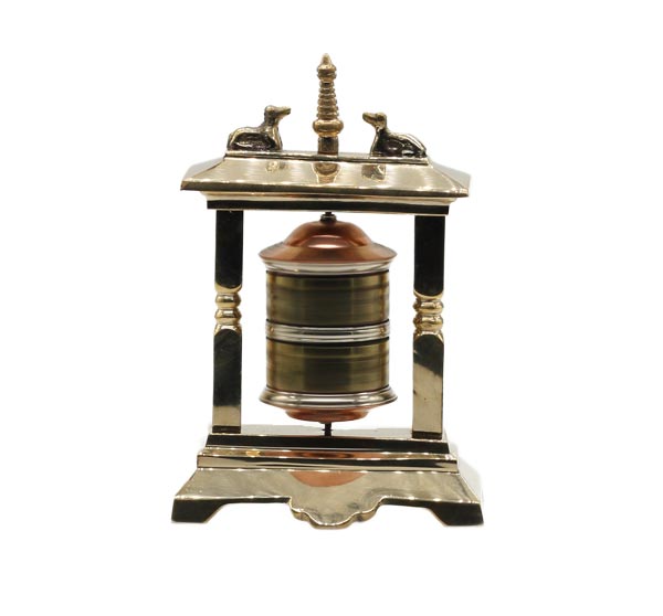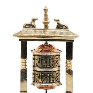 Auf die Oberfläche der Tischgebetsmühle, gefertigt aus Messing, Kupfer und Weißmetall, ist das tibetischen Mantra "Om Mani Padme Hum", das übersetzt soviel, wie "Du Juwel in der Lotusblüte" bedeutet, eingearbeitet. Im Korpus befindet sich eine Papierrolle, die ebenfalls mit wichtigen Mantras, beschrieben ist. Höhe ca. 14 cm. Gewicht etwa 375 g.