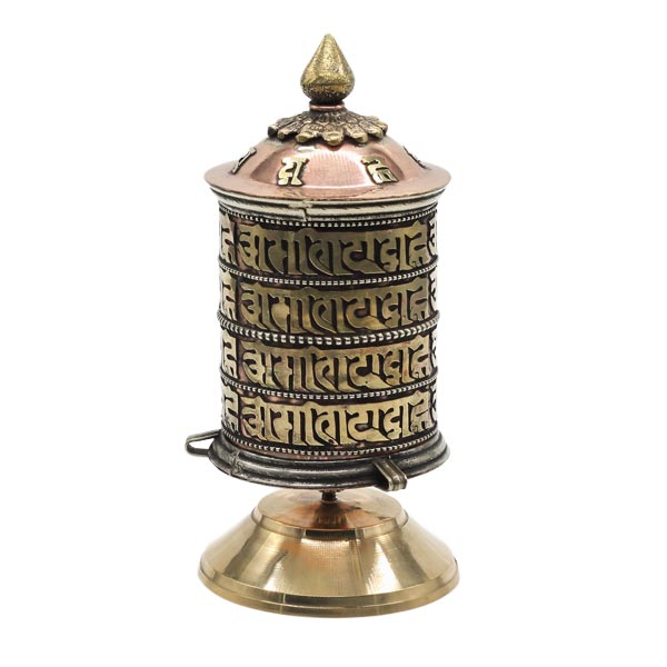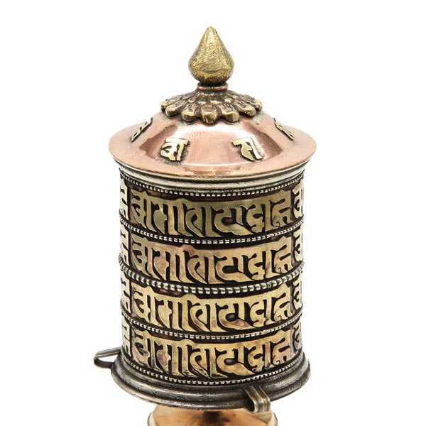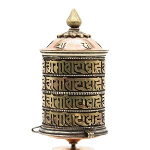 Auf die Oberfläche dieser Tischgebetsmühle, gefertigt in Messing, Kupfer und Weißmetall, ist das tibetischen Mantra "Om Mani Padme Hum", das übersetzt soviel, wie "Du Juwel in der Lotusblüte" bedeutet, mehrfach eingearbeitet. Im Korpus befindet sich eine Papierrolle, die ebenfalls mit wichtigen Mantras, beschrieben ist. Höhe ca. 14,50 cm. Gewicht etwa 175 g.
