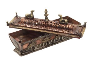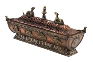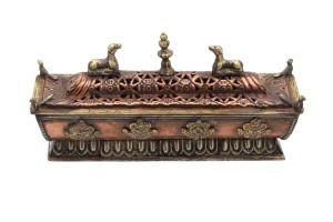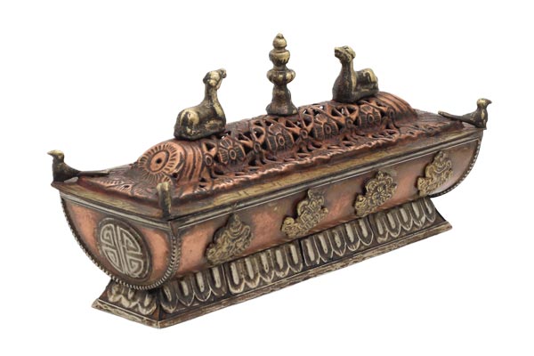 Das Symbol von zwei Rehen auf dem Deckel, die eine Schatzvase flankieren, ist ein zentrales Merkmal auf den Dächern tibetisch-buddhistischer Klöster. Die Schatzvase ist eines der acht glückverheißenden Symbole des Buddhismus.