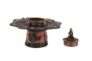 Runder Räucherstäbchenhalter verziert mit den acht buddhistischen Glückssymbolen und einem Buddha.