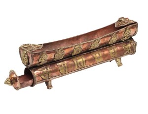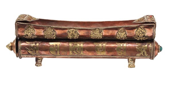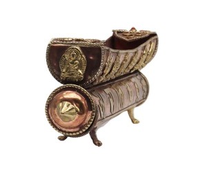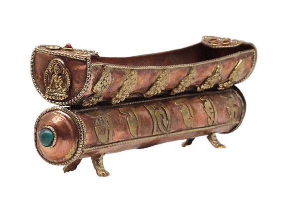 Das tibetische Mantra "Om Mani Padme Hum", das übersetzt soviel wie "Du Juwel in der Lotusblüte" bedeutet, ist auf beiden Seiten des Räucherstäbchenhaltes aufgearbeitet.