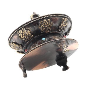 Sowohl das tibetische Mantra "Om Mani Padme Hum", das übersetzt soviel wie "Du Juwel in der Lotusblüte" bedeutet, als auch die Buddhistischen Glückssymbole sind auf den Räucherstäbchenhalter aufgearbeitet. Zudem mit roten und türkisen Steinchen verziert.