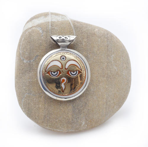 Dieser kunstvoll gearbeitete, runde Anhänger stammt aus den traditionellen Werkstätten Nepals und vereint tiefe spirituelle Symbole aus dem Buddhismus und Hinduismus. Auf der Vorderseite sind die allsehenden Augen Buddhas dargestellt – ein Symbol für Weisheit und Achtsamkeit, das in Nepal häufig an Stupas zu finden ist.