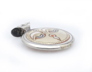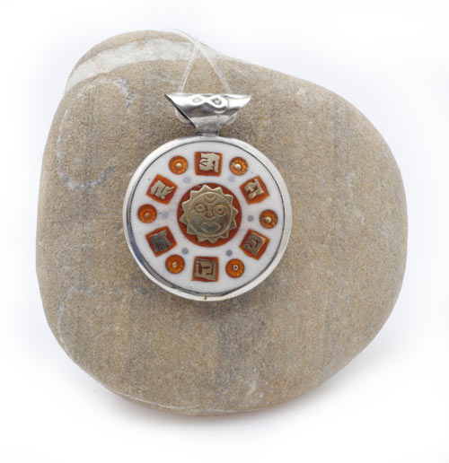 Runder, handgefertigter Anhänger mit spiritueller Einlegearbeit aus Nepal.