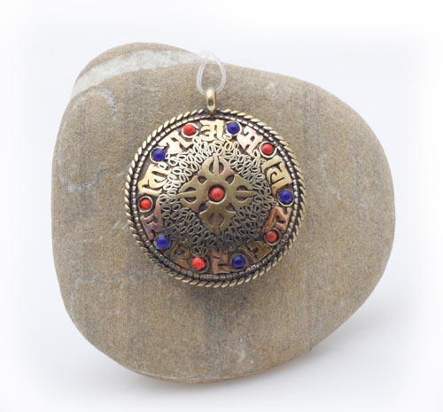 Handgefertigter Anhänger aus verschiedenen Metallen. Beidseitig mit blauen und roten Steinchen verziert. Auf der einen Seite, des beidseitig zu tragenden Anhängers, ist in der Mitte das OM-Zeichen. Im Gebet zu den Göttern werden heilige Formeln, Mantras, gesprochen. Es sind einfache Worte, Silben und Klänge, die in einer bestimmten Abfolge, Tonhöhe und bestimmten Rhythmus ausgesprochen werden müssen. Die vedische Silbe OM, ausgesprochen AUM, gilt als die heiligste aller Mantras. Auf der anderen Seite ist das Vishvavajra Zeichen, der doppelte Donnerkeil, dargestellt. Vishvavajra symbolisiert das Absolute. In Tibet steht er für das Rad des richtigen Weges; er ist unverwüstlich. Beidseitig ist zudem jeweils um das Om Zeichen und Vishvavajra Zeichen das tibetische Mantra "Om Mani Padme Hum", das übersetzt so viel, wie "Du Juwel in der Lotusblüte" bedeutet, dargestellt.