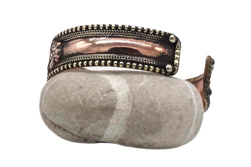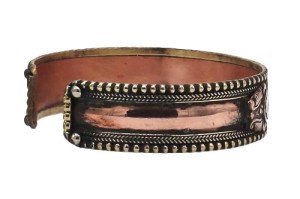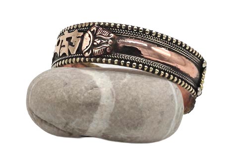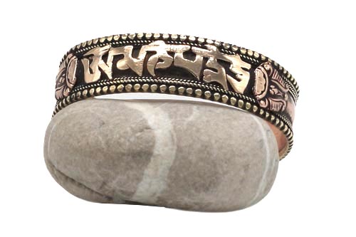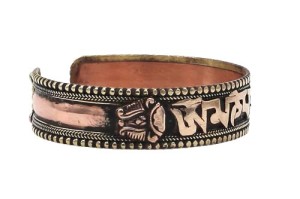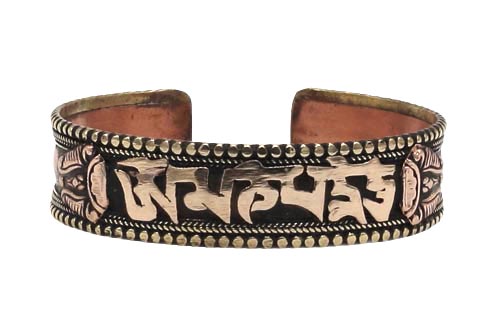 Armreif aus Kupfer und Messing, mit von Hand in die Oberseite gravierten Om Mani Padme Hum, das übersetzt soviel, wie "Du Juwel in der Lotusblüte" bedeutet. Sehr schöner, in Handarbeit hergestellter Armreif aus einer kleinen Manufaktur in Patan, Tal von Kathmandu, Nepal.
