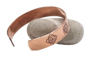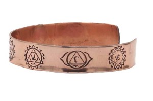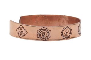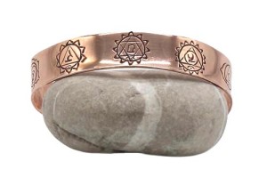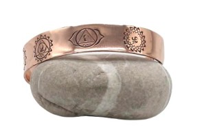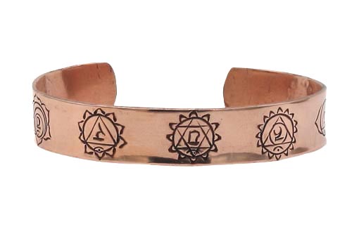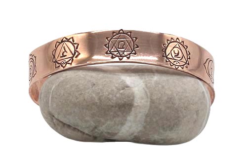 Kupfener Armreif, auf den die sieben Chakren, die sieben Hauptenergiezentren des Körpers, eingearbeitet sind, die in der yogischen und spirituellen Tradition häufig erwähnt werden. Jedes Chakra ist mit einer spezifischen Bedeutung verbunden.