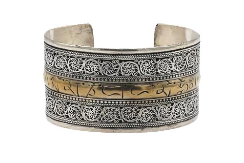 Breiter, filigraner Armreif mit von Hand in die Oberseite gravierten Om Mani Padme Hum, das übersetzt soviel, wie "Du Juwel in der Lotusblüte" bedeutet. Sehr schöner, in Handarbeit hergestellter Armreif aus einer kleinen Manufaktur in Patan, Tal von Kathmandu, Nepal.