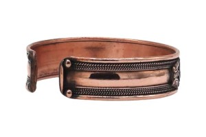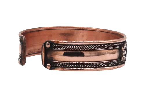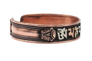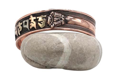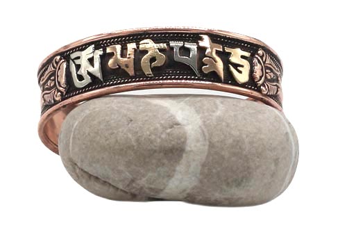 Om Mani Armreif aus Kupfer. Das tibetische Mantra "Om Mani Padme Hum", das übersetzt soviel, wie "Du Juwel in der Lotusblüte" bedeutet, schmückt diesen Armreif. Die Schriftzeichen sind in Kupfer, Messing und Weißmetall gefertigt. Sehr schöner, in Handarbeit hergestellter Armreif aus einer kleinen Manufaktur in Patan, Tal von Kathmandu, Nepal.