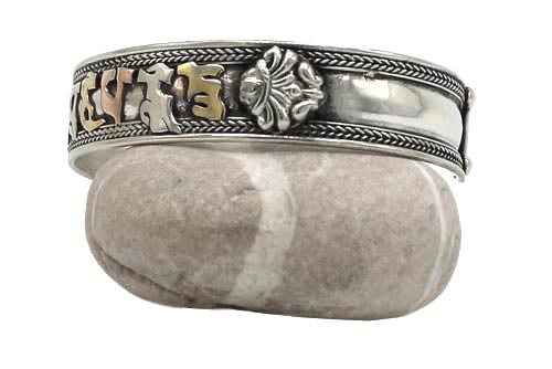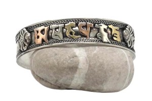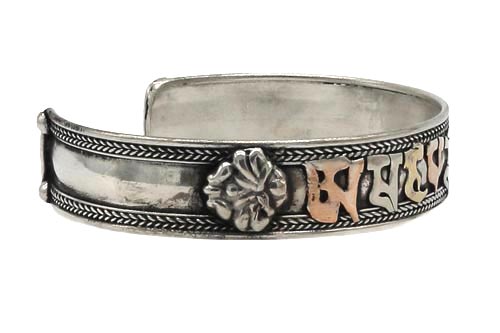 Om Mani Armreif aus Weißmetall. Das tibetische Mantra "Om Mani Padme Hum", das übersetzt soviel, wie "Du Juwel in der Lotusblüte" bedeutet, schmückt diesen Armreif. Die Schriftzeichen sind in Kupfer, Messing und Weißmetall gefertigt. Sehr schöner, in Handarbeit hergestellter Armreif aus einer kleinen Manufaktur in Patan, Tal von Kathmandu, Nepal.