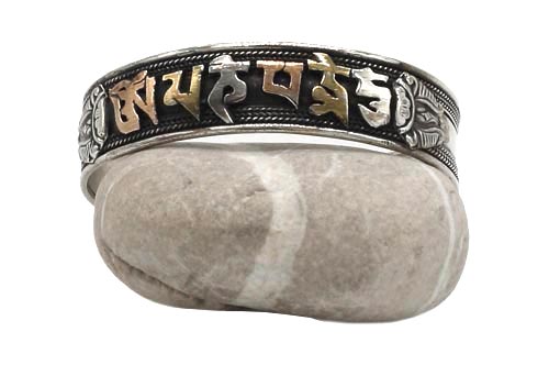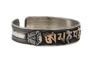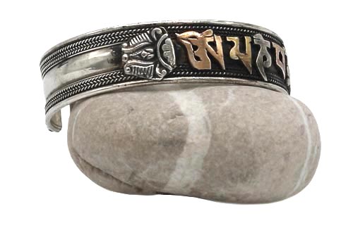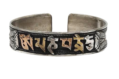 Om Mani Armreif aus Weißmetall. Das tibetische Mantra "Om Mani Padme Hum", das übersetzt soviel, wie "Du Juwel in der Lotusblüte" bedeutet, schmückt diesen Armreif. Die Schriftzeichen sind in Kupfer, Messing und Weißmetall gefertigt. Sehr schöner, in Handarbeit hergestellter Armreif aus einer kleinen Manufaktur in Patan, Tal von Kathmandu, Nepal.
