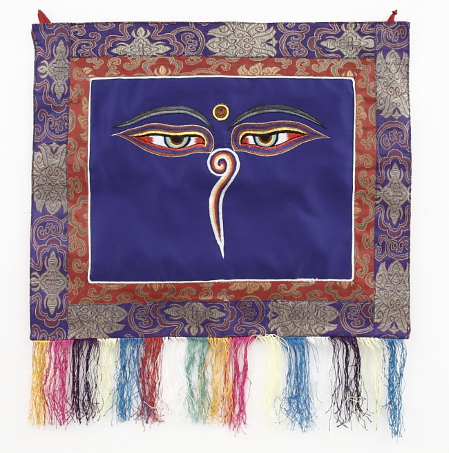 Die Augen, das mystische dritte Auge (Symbol der Weisheit) sowie die "Nase" sind auf hochwertige Kunstseide bestickt. Umrahmt von einer Art Brokatfassung und bunten Fransen.