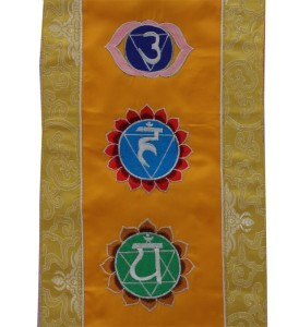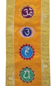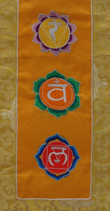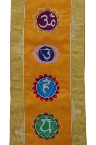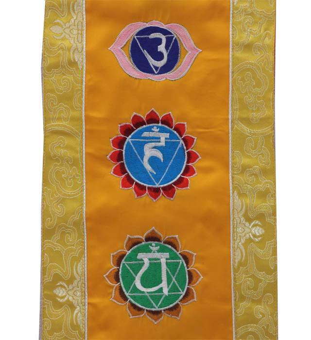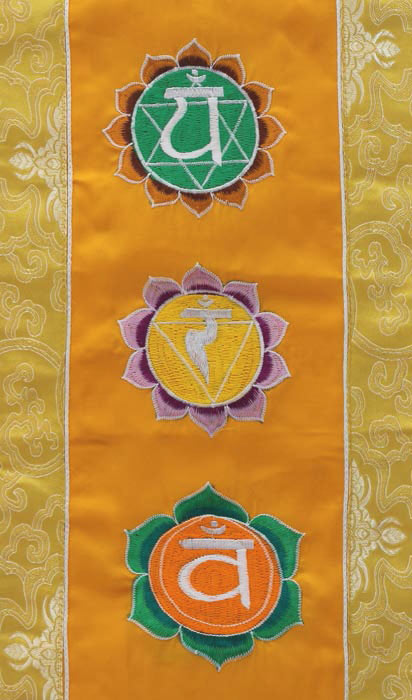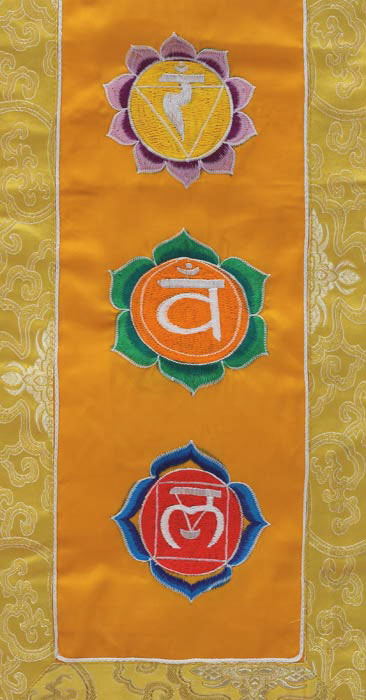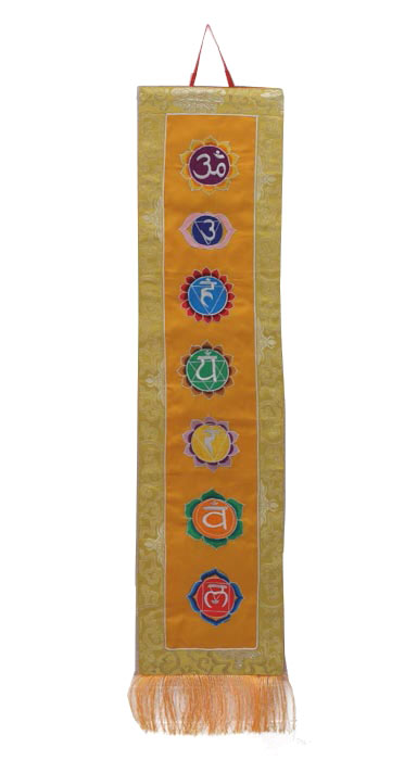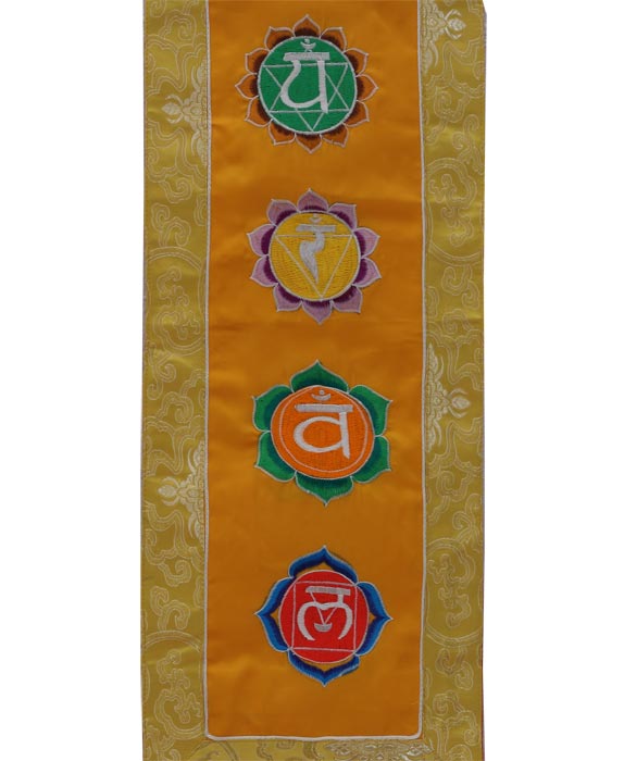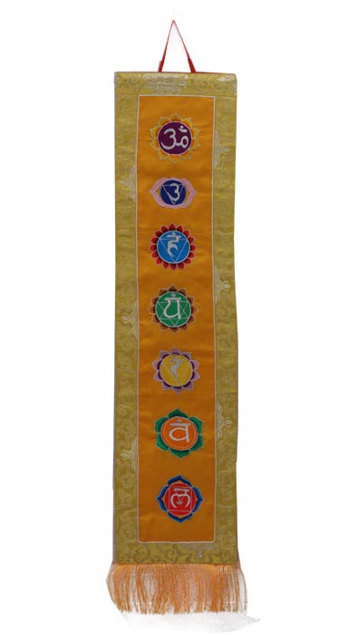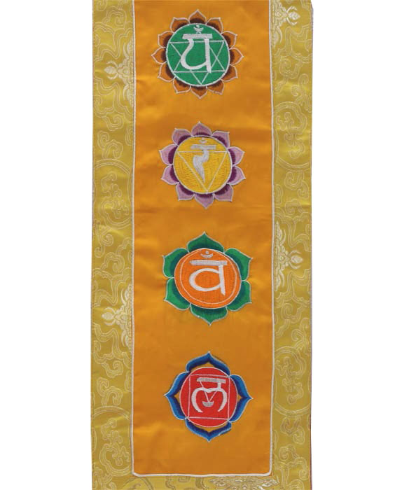 Handbestickter oranger "Sieben Chakren" Wandbehang aus Nepal.