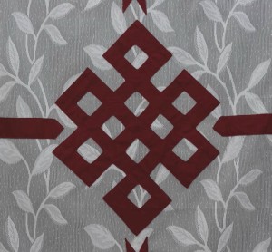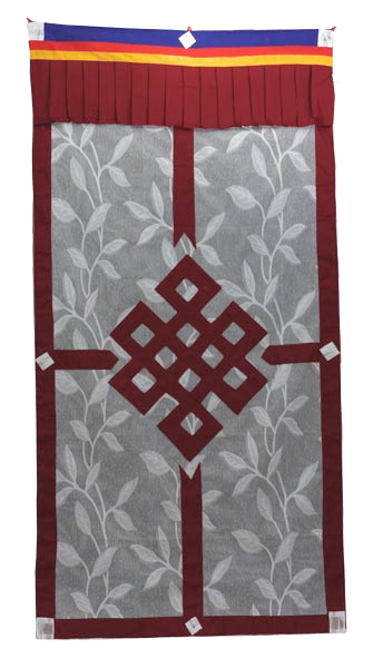 Im Zentrum steht das traditionelle Symbol des Endlosen Knotens, eines der Acht Glückssymbole im tibetischen Buddhismus, das für ewige Harmonie, Weisheit und die unendliche Verbindung aller Dinge steht. Umgeben von stilisierten Blütenmotiven, symbolisiert der Behang zudem Schönheit, spirituelles Wachstum und das Erblühen des Geistes.