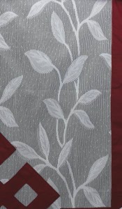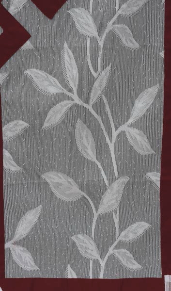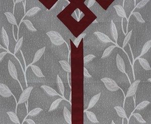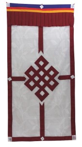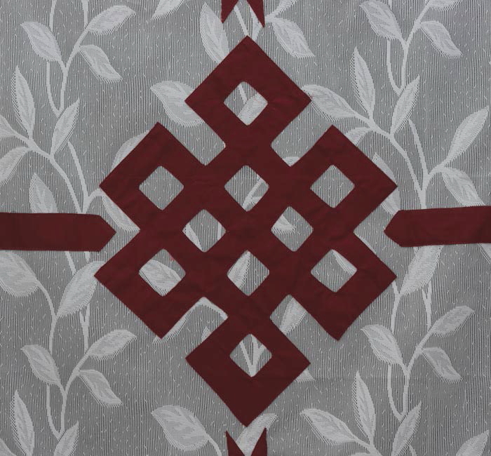 Dunkelrot/weißer, teilweise lichtdurchlässiger tibetischer Türbehang mit dem Endlosem Knoten & Blüten – Handgefertigt in Nepal